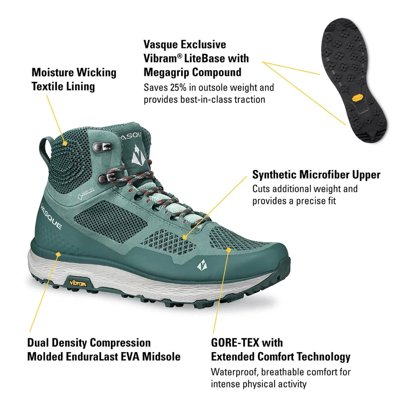 - Vasque-exclusive outsoles combine Vibram Megagrip with Vibram Lightbase technology, providing sure footing across varying surfaces and saving 25% in weight
